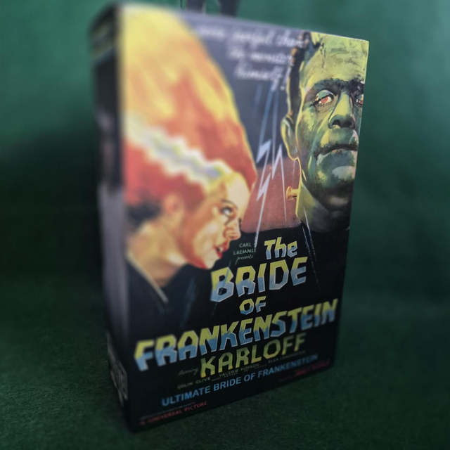 NECA's Ultimate 7-inch Bride of Frankenstein from the Universal Monsters series. Premium sculpt, detailed paint work, multiple interchangeable heads and hands. Comes in original packaging. Opened once to verify contents, has been stored safely since. Ideal for display or as part of a collection.
